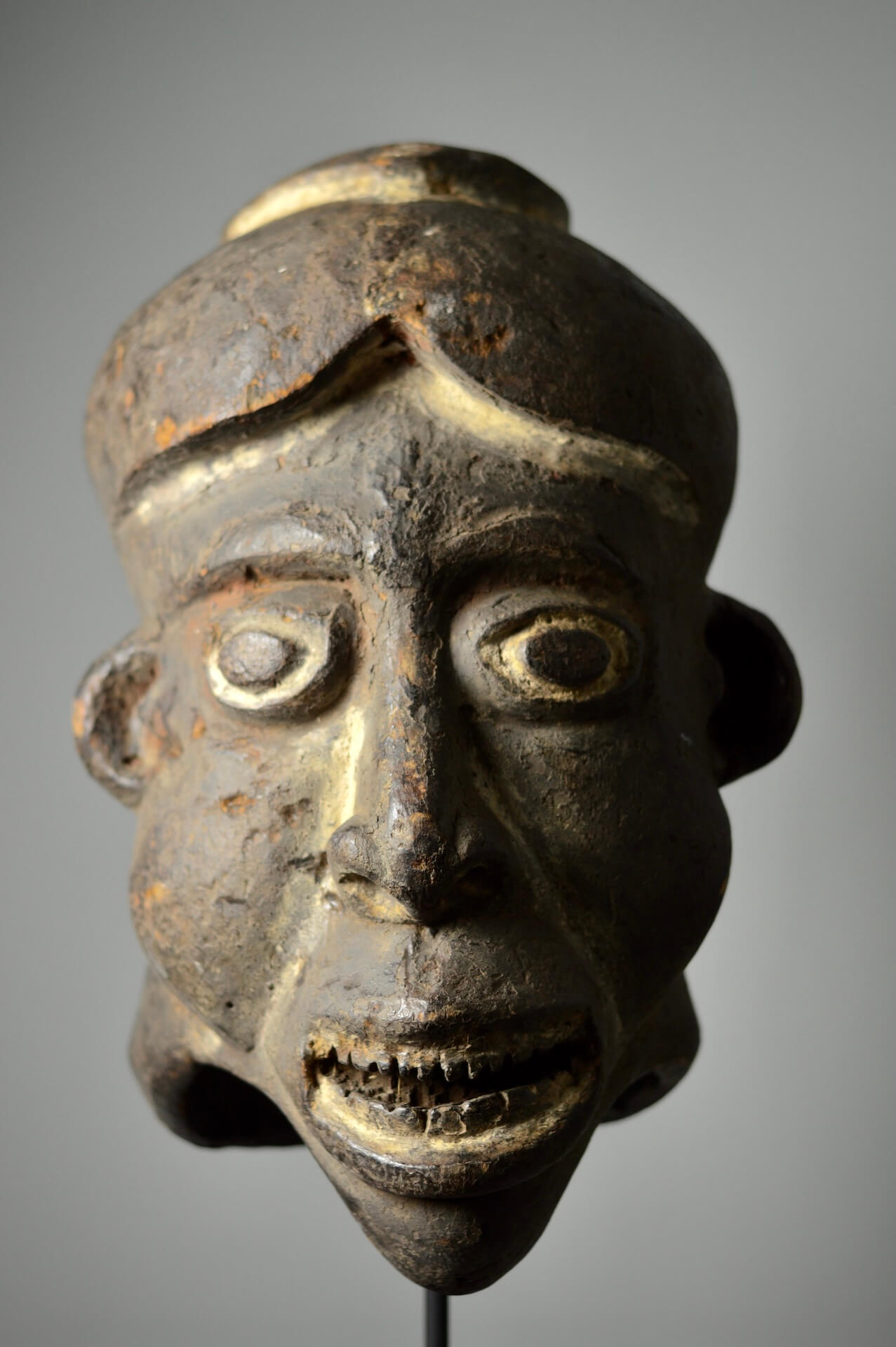Paul Gebauer, the seminal collector and writer on the art of Cameroon, wrote that Grassfields masks, when “displayed in a museum…convey only a fraction of their dramatic qualities… Deprived of their swirling feather-cloaks, the pulsating drumbeats, and the tidal waves of song, these masks are limited witness… But there are some advantages in a museum display. One becomes aware of the extraordinary variety of styles.”